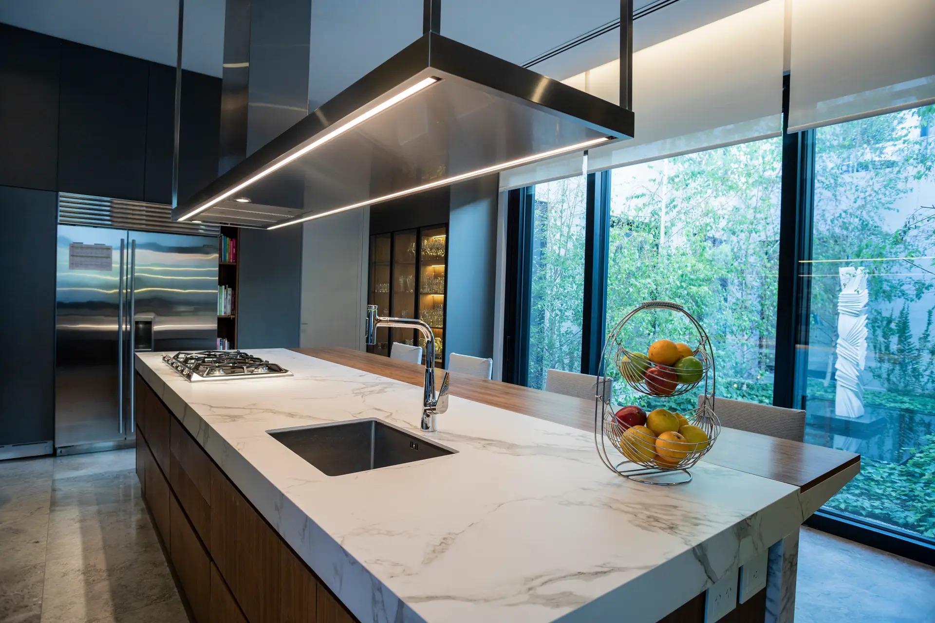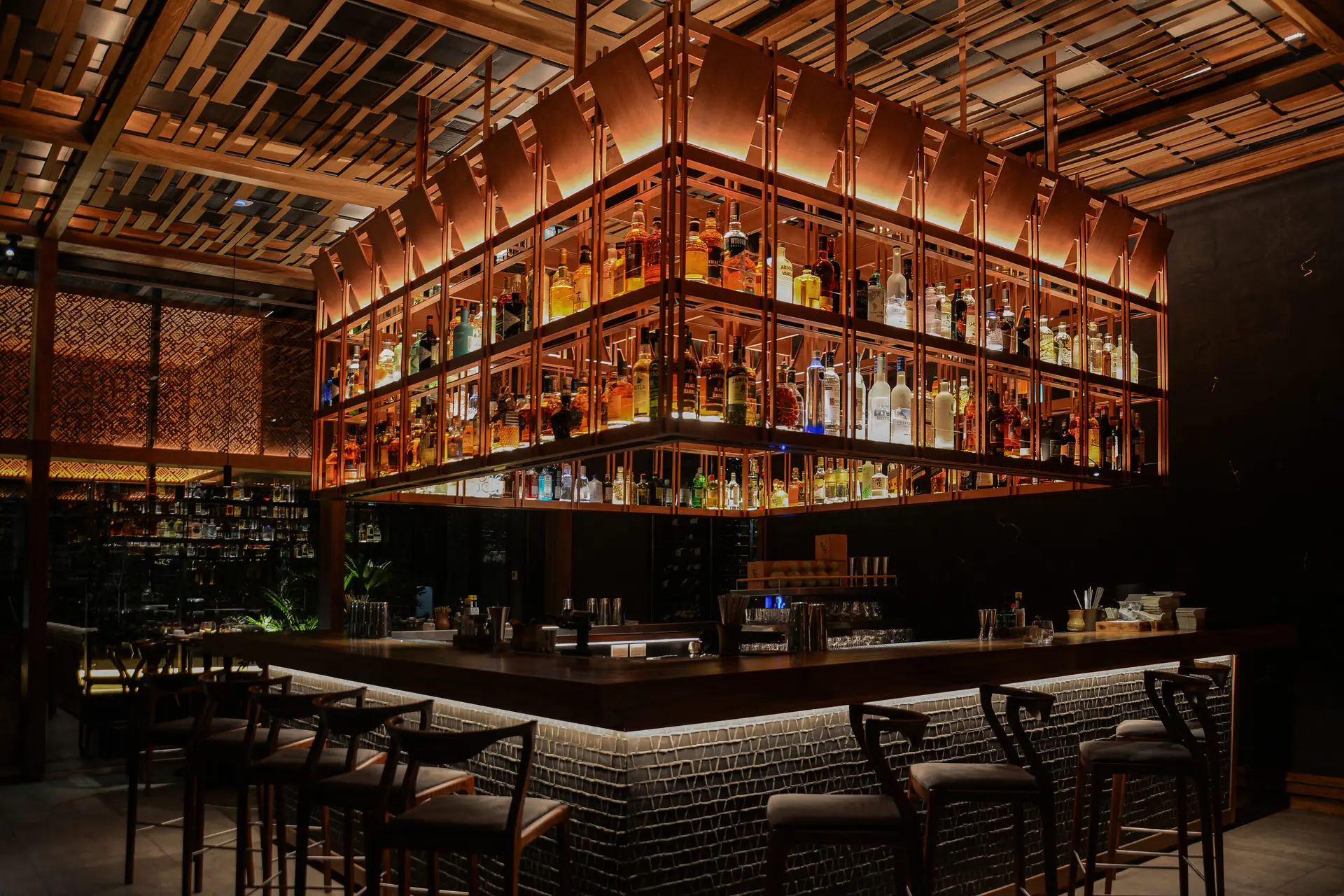 El ambiente es parte de la experiencia gastronómica. Iluminación, sonido y clima integrados para reforzar la identidad del espacio.