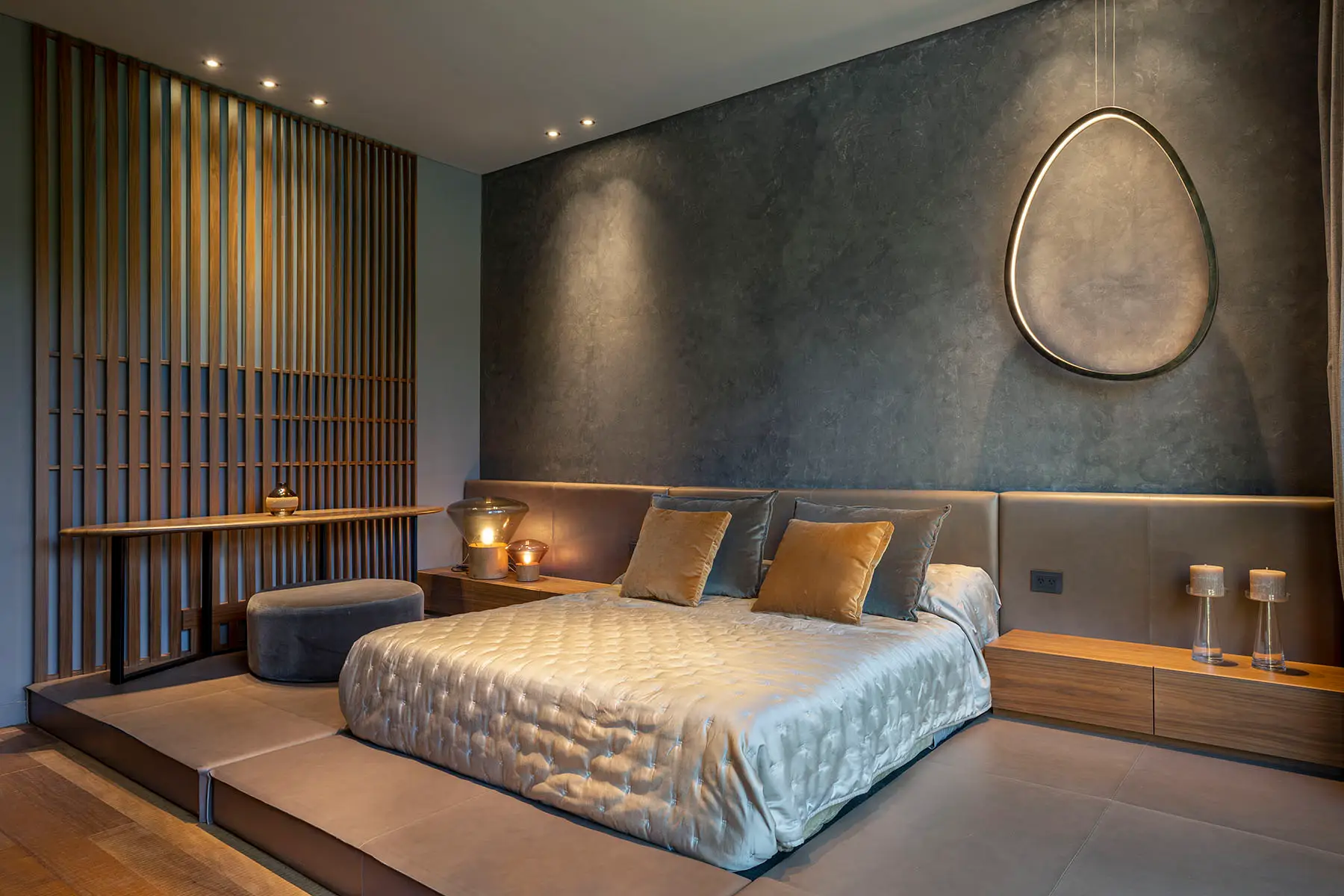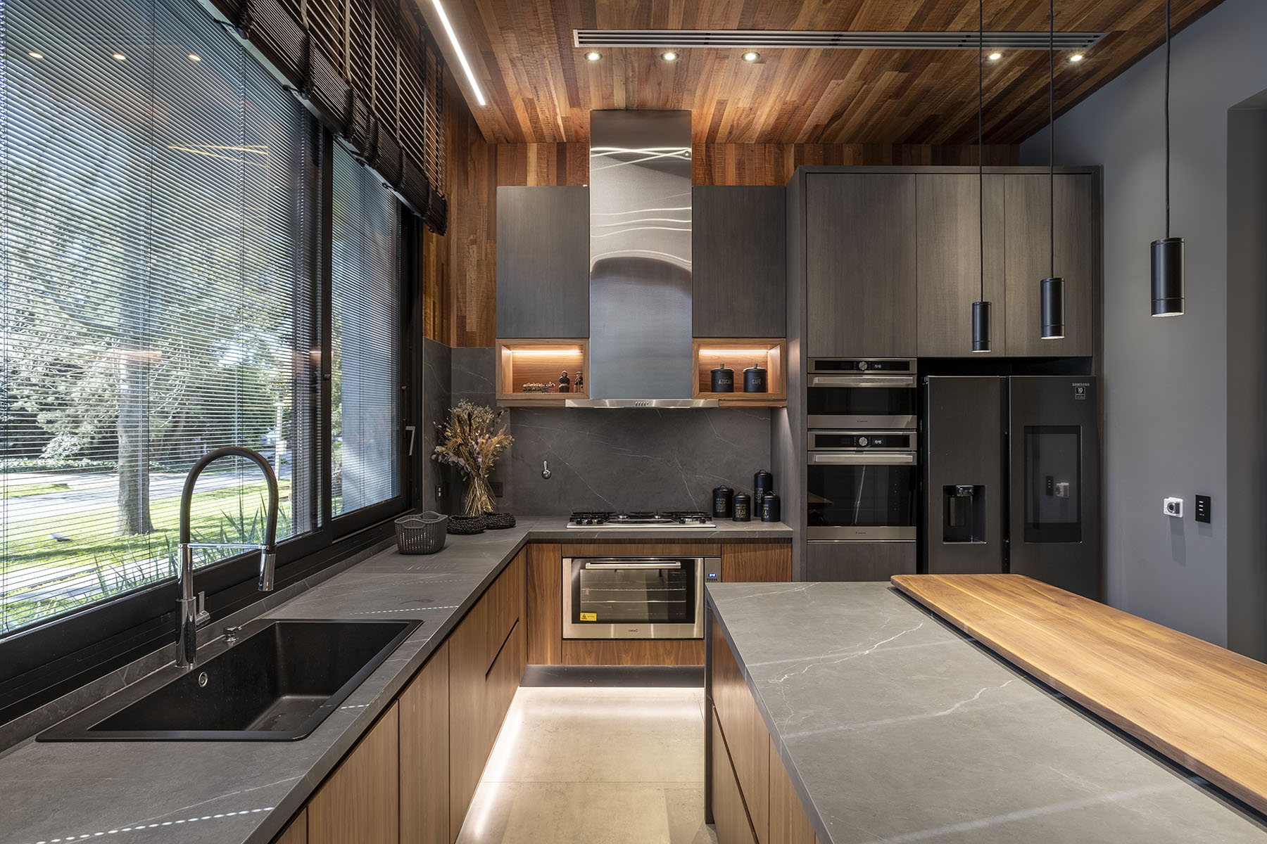 El proyecto incorpora Lutron HomeWorks con teclados Palladiom personalizados, grabados y retroiluminados, permitiendo crear escenas lumínicas simples de operar y cuidadosamente integradas a la arquitectura. La iluminación combina artefactos de marcas nacionales con piezas decorativas desarrolladas a medida, integradas al sistema para lograr una regulación precisa y una atmósfera cálida.