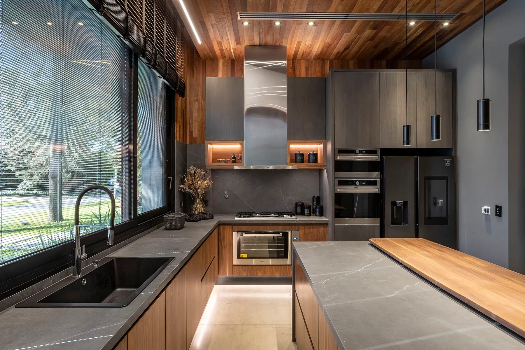 La intervención también incluyó la iluminación exterior del parque, fachada, pileta y solárium, generando una experiencia visual que acompaña desde el acceso hasta los espacios de uso exterior. Además, se diseñó una red cableada e inalámbrica con tecnología Ubiquiti, pensada para brindar conectividad estable en toda la residencia.