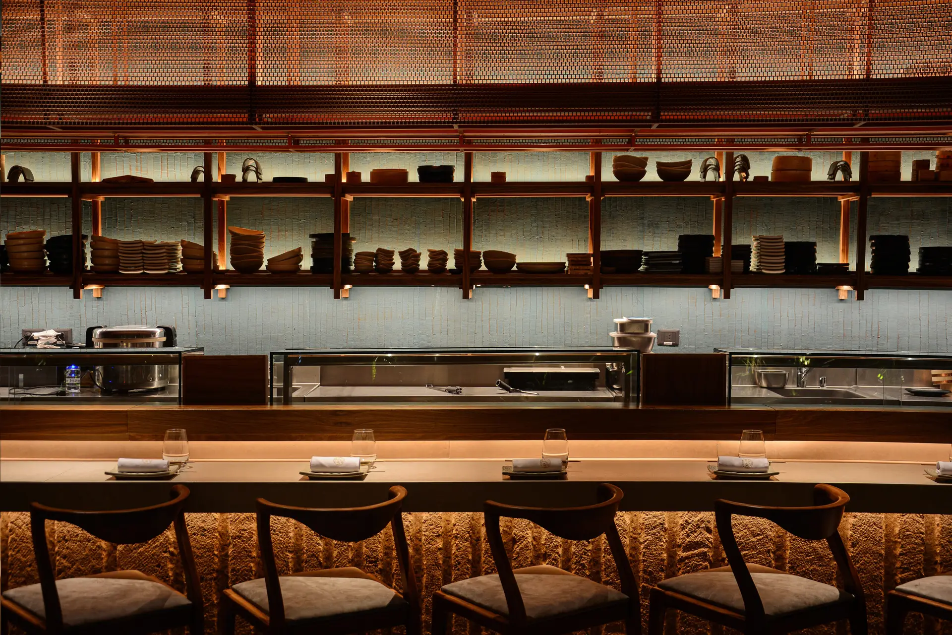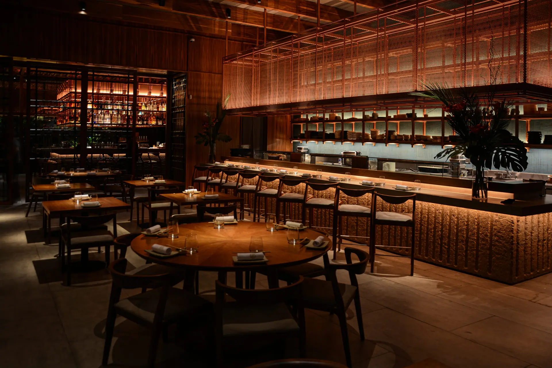 La iluminación acompaña la barra, los recorridos y los distintos sectores del restaurante, generando profundidad, confort visual y una paleta de tonos cálidos, óxidos y pasteles que potencia la materialidad del espacio.
